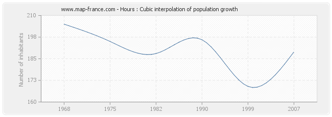 Population of Hours was 189 inhabitants in 2007, 169 inhabitants in 1999, 196 inhabitants in 1990, 188 inhabitants in 1982, 195 inhabitants in 1975 and 205 inhabitants in 1968.