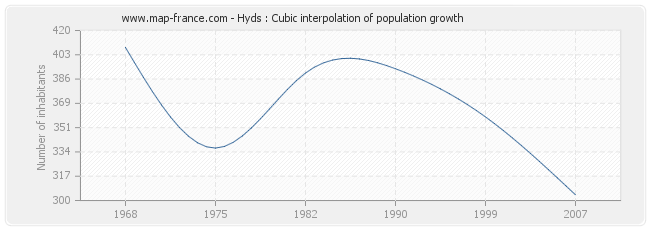 This curve shows the history of the population of Hyds from 1968 to 2007 in cubic interpolation. This provides more precisely the population of the municipality of Hyds the years where no census has been taken.