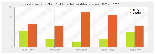 Ilhet : evolution of births and deaths from 1968 to 2007