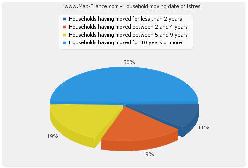- Number of households of Istres having moved between 2 and 5 years : 3 246 - Number of households of Istres having moved between 5 and 9 years : 3 339 - Number of households of Istres having moved for 10 years or more : 8 583 |