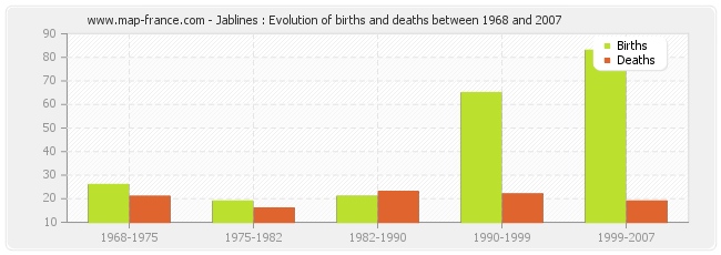 Population of Jablines was 628 inhabitants in 2007, 576 inhabitants in 1999, 333 inhabitants in 1990, 260 inhabitants in 1982, 260 inhabitants in 1975 and 288 inhabitants in 1968.