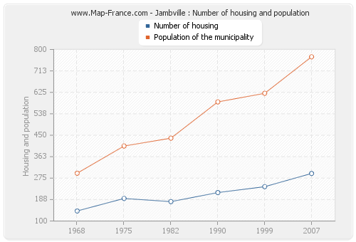 The population of Jambville was 770 inhabitants in 2007, 621 inhabitants in 1999, 586 inhabitants in 1990, 438 inhabitants in 1982, 406 inhabitants in 1975 and 295 inhabitants in 1968. Meanwhile, the number of housing of Jambville was 294 in 2007, 240 in 1999, 216 in 1990, 179 in 1982, 192 in 1975 and 141 in 1968.