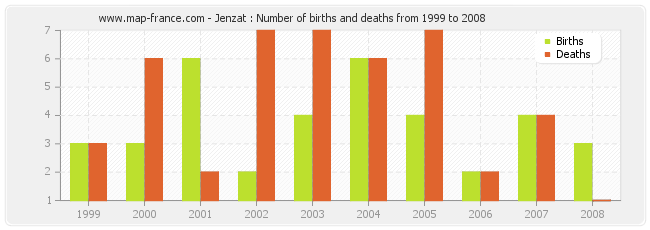 Jenzat : evolution of births and deaths from 1968 to 2007