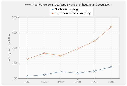 The population of Jeufosse was 438 inhabitants in 2007, 345 inhabitants in 1999, 297 inhabitants in 1990, 250 inhabitants in 1982, 267 inhabitants in 1975 and 229 inhabitants in 1968. Meanwhile, the number of housing of Jeufosse was 176 in 2007, 151 in 1999, 135 in 1990, 146 in 1982, 125 in 1975 and 115 in 1968.