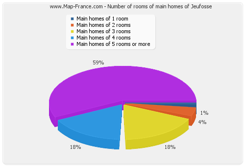 - Number of main homes of Jeufosse of 1 room : 1 - Number of main homes of Jeufosse of 2 rooms : 6 - Number of main homes of Jeufosse of 3 rooms : 27 - Number of main homes of Jeufosse of 4 rooms : 27 - Number of main homes of Jeufosse of 5 rooms and more : 88 |