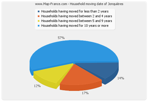 - Number of households of Jonquières having moved between 2 and 5 years : 27 - Number of households of Jonquières having moved between 5 and 9 years : 20 - Number of households of Jonquières having moved for 10 years or more : 92 |