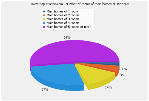 - Number of main homes of Jonzieux of 1 room : 5 - Number of main homes of Jonzieux of 2 rooms : 19 - Number of main homes of Jonzieux of 3 rooms : 65 - Number of main homes of Jonzieux of 4 rooms : 65 - Number of main homes of Jonzieux of 5 rooms and more : 259 |