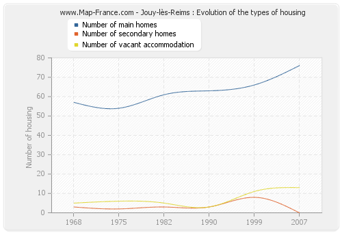 The number of housing of Jouy-lès-Reims was 88 in 2007, 85 in 1999, 69 in 1990, 69 in 1982, 62 in 1975 and 65 in 1968.