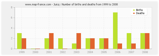 Population of Juicq was 181 inhabitants in 2007, 165 inhabitants in 1999, 169 inhabitants in 1990, 158 inhabitants in 1982, 131 inhabitants in 1975 and 134 inhabitants in 1968.