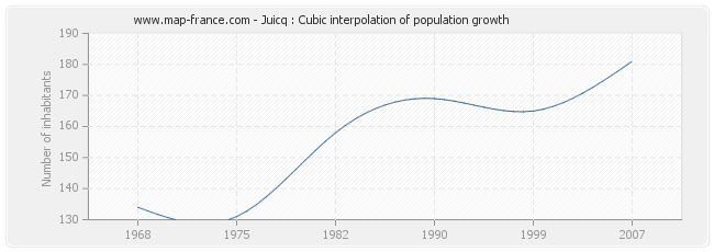 This curve shows the history of the population of Juicq from 1968 to 2007 in cubic interpolation. This provides more precisely the population of the municipality of Juicq the years where no census has been taken.