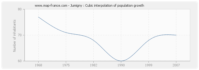 This curve shows the history of the population of Jumigny from 1968 to 2007 in cubic interpolation. This provides more precisely the population of the municipality of Jumigny the years where no census has been taken.