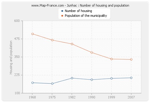 The population of Junhac was 333 inhabitants in 2007, 336 inhabitants in 1999, 381 inhabitants in 1990, 440 inhabitants in 1982, 467 inhabitants in 1975 and 510 inhabitants in 1968. Meanwhile, the number of housing of Junhac was 206 in 2007, 202 in 1999, 193 in 1990, 204 in 1982, 166 in 1975 and 172 in 1968.