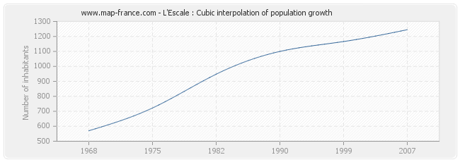 This curve shows the history of the population of L'Escale from 1968 to 2007 in cubic interpolation. This provides more precisely the population of the municipality of L'Escale the years where no census has been taken.