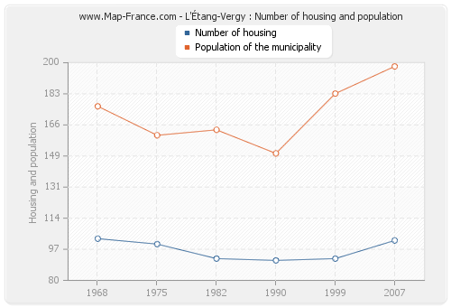 The population of L'Étang-Vergy was 198 inhabitants in 2007, 183 inhabitants in 1999, 150 inhabitants in 1990, 163 inhabitants in 1982, 160 inhabitants in 1975 and 176 inhabitants in 1968. Meanwhile, the number of housing of L'Étang-Vergy was 102 in 2007, 92 in 1999, 91 in 1990, 92 in 1982, 100 in 1975 and 103 in 1968.