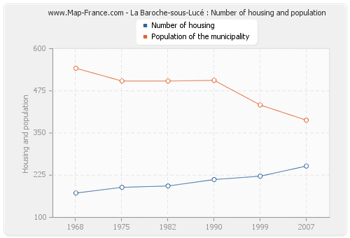 The population of La Baroche-sous-Lucé was 388 inhabitants in 2007, 433 inhabitants in 1999, 506 inhabitants in 1990, 504 inhabitants in 1982, 504 inhabitants in 1975 and 542 inhabitants in 1968. Meanwhile, the number of housing of La Baroche-sous-Lucé was 252 in 2007, 222 in 1999, 212 in 1990, 193 in 1982, 189 in 1975 and 172 in 1968.