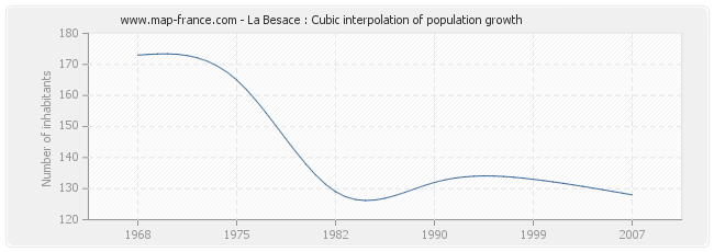 This curve shows the history of the population of La Besace from 1968 to 2007 in cubic interpolation. This provides more precisely the population of the municipality of La Besace the years where no census has been taken.