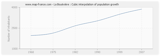 This curve shows the history of the population of La Bouëxière from 1968 to 2007 in cubic interpolation. This provides more precisely the population of the municipality of La Bouëxière the years where no census has been taken.