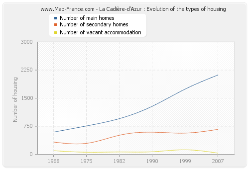 The following graphs show the history of the number and the type of housing of La Cadière-d'Azur from 1968 to 2007. The second graph is drawn in cubic interpolation. This allows to obtain more exactly the number of accommodation of the city of La Cadière-d'Azur years where no inventory was made.