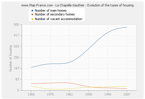 The following graphs show the history of the number and the type of housing of La Chapelle-Gauthier from 1968 to 2007. The second graph is drawn in cubic interpolation. This allows to obtain more exactly the number of accommodation of the town of La Chapelle-Gauthier years where no inventory was made.