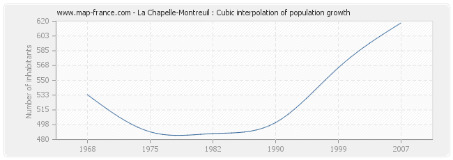 This curve shows the history of the population of La Chapelle-Montreuil from 1968 to 2007 in cubic interpolation. This provides more precisely the population of the municipality of La Chapelle-Montreuil the years where no census has been taken.