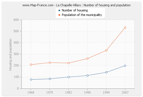 The population of La Chapelle-Villars was 533 inhabitants in 2007, 333 inhabitants in 1999, 262 inhabitants in 1990, 223 inhabitants in 1982, 227 inhabitants in 1975 and 209 inhabitants in 1968. Meanwhile, the number of housing of La Chapelle-Villars was 200 in 2007, 142 in 1999, 114 in 1990, 101 in 1982, 85 in 1975 and 79 in 1968.