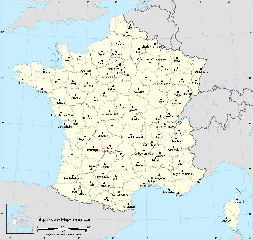 Map of La Chapelle-aux-Brocs with departments and prefectures