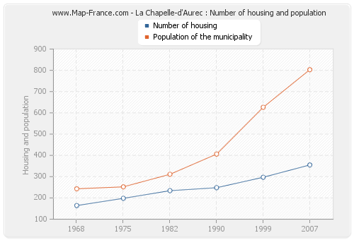 The population of La Chapelle-d'Aurec was 803 inhabitants in 2007, 626 inhabitants in 1999, 406 inhabitants in 1990, 311 inhabitants in 1982, 252 inhabitants in 1975 and 243 inhabitants in 1968. Meanwhile, the number of housing of La Chapelle-d'Aurec was 355 in 2007, 297 in 1999, 248 in 1990, 234 in 1982, 198 in 1975 and 164 in 1968.