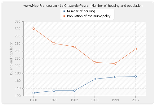 The population of La Chaze-de-Peyre was 246 inhabitants in 2007, 207 inhabitants in 1999, 210 inhabitants in 1990, 252 inhabitants in 1982, 261 inhabitants in 1975 and 301 inhabitants in 1968. Meanwhile, the number of housing of La Chaze-de-Peyre was 172 in 2007, 171 in 1999, 165 in 1990, 134 in 1982, 134 in 1975 and 128 in 1968.
