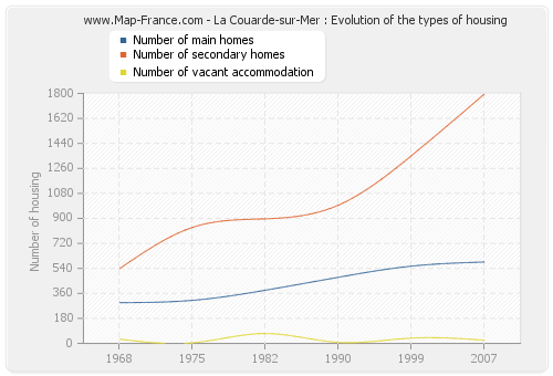 The following graphs show the history of the number and the type of housing of La Couarde-sur-Mer from 1968 to 2007. The second graph is drawn in cubic interpolation. This allows to obtain more exactly the number of accommodation of the town of La Couarde-sur-Mer years where no inventory was made.