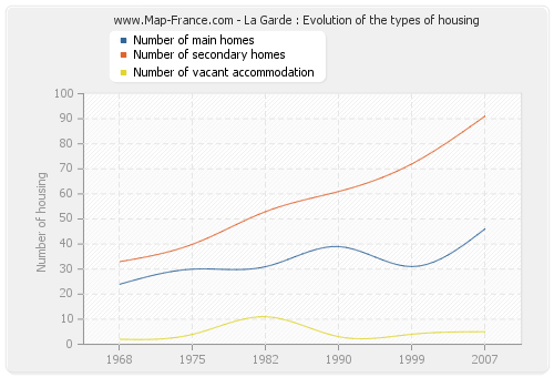 In 2007 the accommodations of La Garde consisted of 46 main homes, 91 second homes and 5 vacant accommodations.