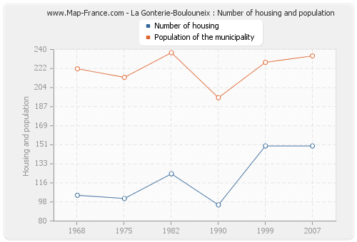 The population of La Gonterie-Boulouneix was 234 inhabitants in 2007, 228 inhabitants in 1999, 195 inhabitants in 1990, 237 inhabitants in 1982, 214 inhabitants in 1975 and 222 inhabitants in 1968. Meanwhile, the number of housing of La Gonterie-Boulouneix was 150 in 2007, 150 in 1999, 95 in 1990, 124 in 1982, 101 in 1975 and 104 in 1968.