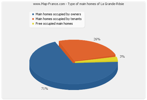 - Number of main homes of La Grande-Résie occupied by owners : 27 - Number of main homes of La Grande-Résie occupied by tenants : 10 - Number of main homes of La Grande-Résie occupied free of charge : 1 |