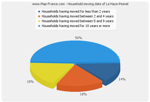 - Number of households of La Haye-Pesnel having moved between 2 and 5 years : 113 - Number of households of La Haye-Pesnel having moved between 5 and 9 years : 113 - Number of households of La Haye-Pesnel having moved for 10 years or more : 311 |