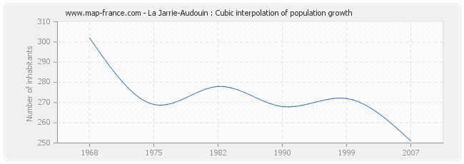 This curve shows the history of the population of La Jarrie-Audouin from 1968 to 2007 in cubic interpolation. This provides more precisely the population of the municipality of La Jarrie-Audouin the years where no census has been taken.