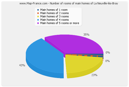 - Number of main homes of La Neuville-lès-Bray of 1 room : 0 - Number of main homes of La Neuville-lès-Bray of 2 rooms : 0 - Number of main homes of La Neuville-lès-Bray of 3 rooms : 27 - Number of main homes of La Neuville-lès-Bray of 4 rooms : 27 - Number of main homes of La Neuville-lès-Bray of 5 rooms and more : 42 |