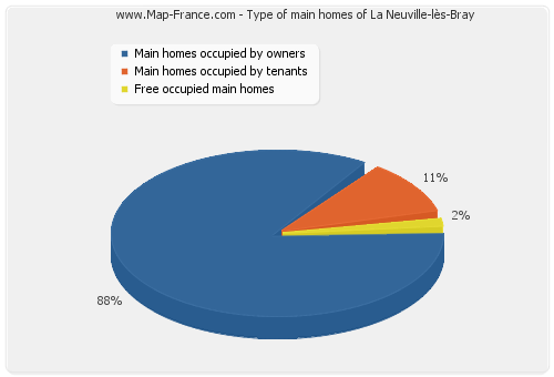 - Number of main homes of La Neuville-lès-Bray occupied by owners : 105 - Number of main homes of La Neuville-lès-Bray occupied by tenants : 13 - Number of main homes of La Neuville-lès-Bray occupied free of charge : 2 |