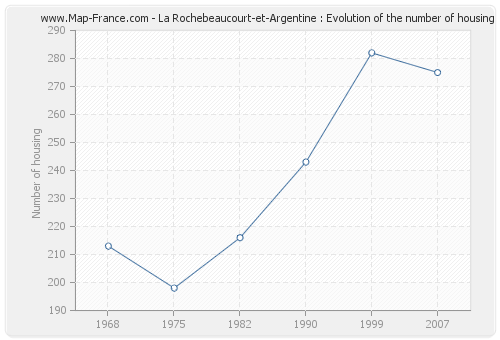 The population of La Rochebeaucourt-et-Argentine was 398 inhabitants in 2007, 397 inhabitants in 1999, 424 inhabitants in 1990, 411 inhabitants in 1982, 408 inhabitants in 1975 and 459 inhabitants in 1968. Meanwhile, the number of housing of La Rochebeaucourt-et-Argentine was 275 in 2007, 282 in 1999, 243 in 1990, 216 in 1982, 198 in 1975 and 213 in 1968.