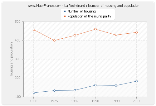 The population of La Rochénard was 443 inhabitants in 2007, 429 inhabitants in 1999, 460 inhabitants in 1990, 427 inhabitants in 1982, 400 inhabitants in 1975 and 457 inhabitants in 1968. Meanwhile, the number of housing of La Rochénard was 183 in 2007, 160 in 1999, 162 in 1990, 135 in 1982, 133 in 1975 and 122 in 1968.