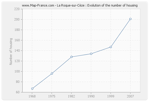 The number of housing of La Roque-sur-Cèze was 201 in 2007, 147 in 1999, 134 in 1990, 128 in 1982, 96 in 1975 and 67 in 1968.