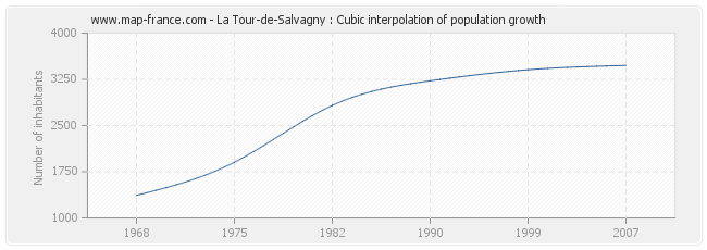 This curve shows the history of the population of La Tour-de-Salvagny from 1968 to 2007 in cubic interpolation. This provides more precisely the population of the municipality of La Tour-de-Salvagny the years where no census has been taken.