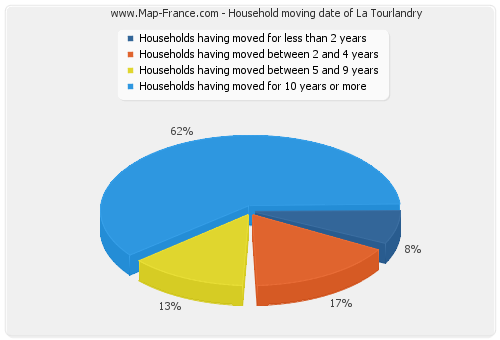 - Number of households of La Tourlandry having moved between 2 and 5 years : 77 - Number of households of La Tourlandry having moved between 5 and 9 years : 62 - Number of households of La Tourlandry having moved for 10 years or more : 289 |
