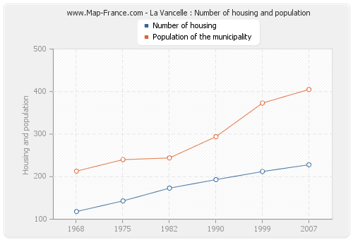 The population of La Vancelle was 405 inhabitants in 2007, 373 inhabitants in 1999, 294 inhabitants in 1990, 244 inhabitants in 1982, 240 inhabitants in 1975 and 213 inhabitants in 1968. Meanwhile, the number of housing of La Vancelle was 228 in 2007, 212 in 1999, 193 in 1990, 173 in 1982, 143 in 1975 and 118 in 1968.