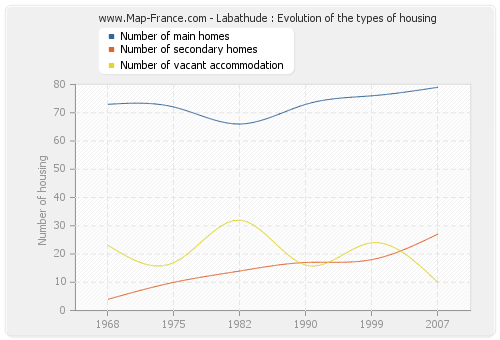 The following graphs show the history of the number and the type of housing of Labathude from 1968 to 2007. The second graph is drawn in cubic interpolation. This allows to obtain more exactly the number of accommodation of the town of Labathude years where no inventory was made.