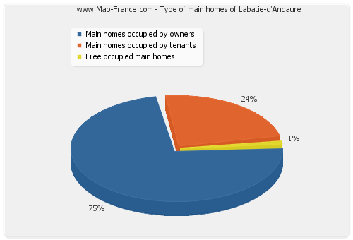 - Number of main homes of Labatie-d'Andaure occupied by owners : 66 - Number of main homes of Labatie-d'Andaure occupied by tenants : 21 - Number of main homes of Labatie-d'Andaure occupied free of charge : 1 |