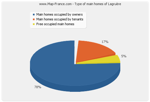 - Number of main homes of Lagruère occupied by owners : 110 - Number of main homes of Lagruère occupied by tenants : 24 - Number of main homes of Lagruère occupied free of charge : 7 |