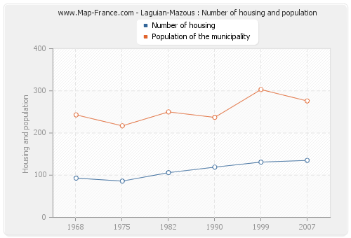 The population of Laguian-Mazous was 276 inhabitants in 2007, 303 inhabitants in 1999, 237 inhabitants in 1990, 250 inhabitants in 1982, 217 inhabitants in 1975 and 243 inhabitants in 1968. Meanwhile, the number of housing of Laguian-Mazous was 135 in 2007, 131 in 1999, 119 in 1990, 106 in 1982, 86 in 1975 and 93 in 1968.