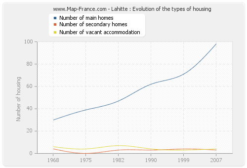 The following graphs show the history of the number and the type of housing of Lahitte from 1968 to 2007. The second graph is drawn in cubic interpolation. This allows to obtain more exactly the number of accommodation of the town of Lahitte years where no inventory was made.