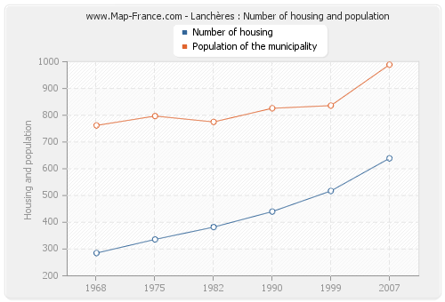 The population of Lanchères was 989 inhabitants in 2007, 836 inhabitants in 1999, 826 inhabitants in 1990, 775 inhabitants in 1982, 797 inhabitants in 1975 and 762 inhabitants in 1968. Meanwhile, the number of housing of Lanchères was 639 in 2007, 517 in 1999, 440 in 1990, 382 in 1982, 336 in 1975 and 285 in 1968.