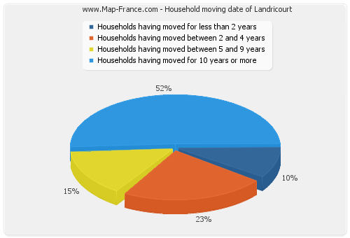 - Number of households of Landricourt having moved between 2 and 5 years : 14 - Number of households of Landricourt having moved between 5 and 9 years : 9 - Number of households of Landricourt having moved for 10 years or more : 31 |