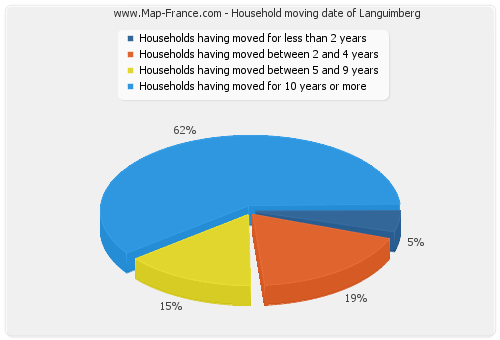 - Number of households of Languimberg having moved between 2 and 5 years : 15 - Number of households of Languimberg having moved between 5 and 9 years : 12 - Number of households of Languimberg having moved for 10 years or more : 50 |